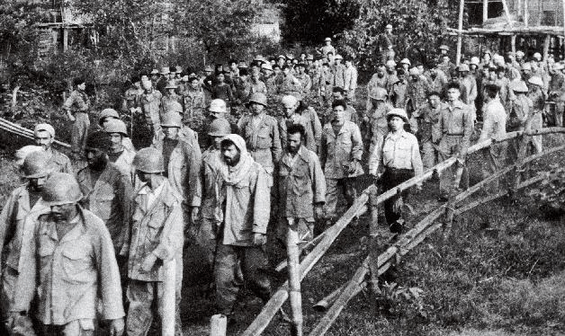 Viet Minh march past the camera some of the ten thousand prisoners who surrendered to them at Dien Bien Phu. They include troops from French colonies in North and West Africa as well as France, Germany, and Indochina.