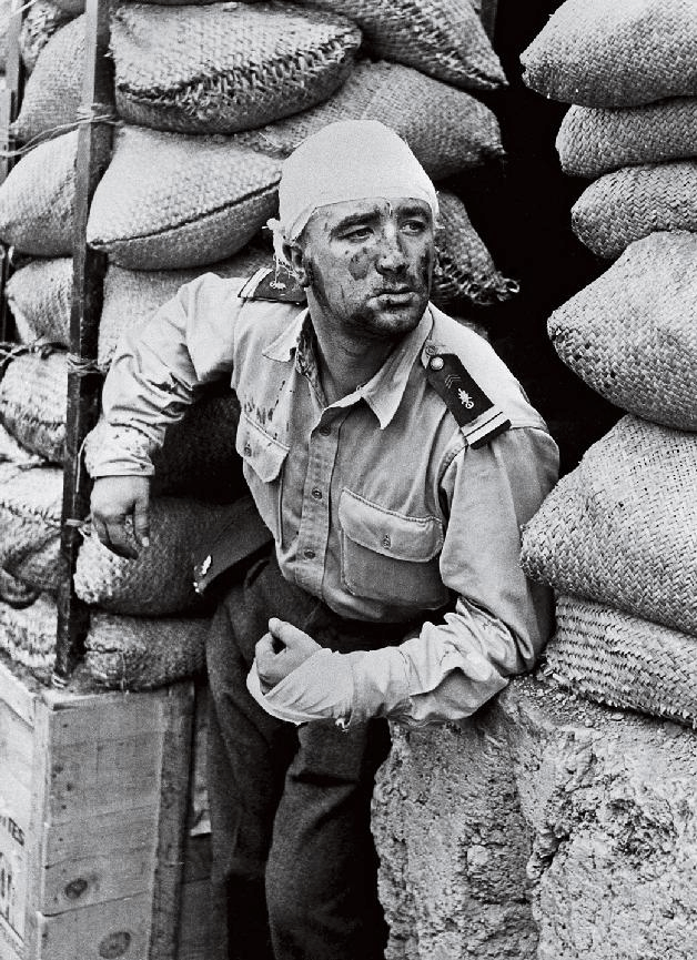 Trong lúc pháo kích tạm lắng, một trung úy Pháp bị thương xuất hiện từ một bệnh xá tạm bợ dưới lòng đất.
