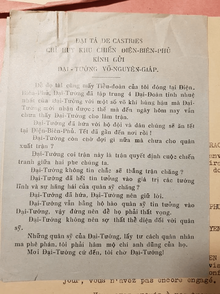 Thư mà De Castries (bằng tiếng Pháp và tiếng Việt) công khai mời gọi và thách tướng Võ Nguyên Giáp tấn công Điện Biên Phủ.