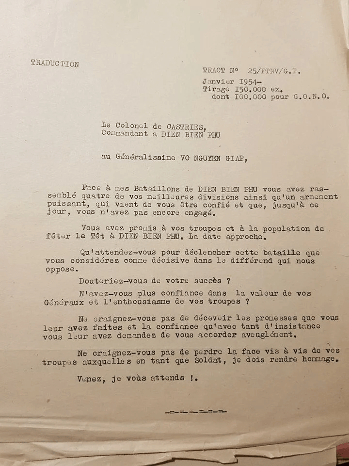 Trước dự đoán rằng khả năng Việt Nam sẽ từ bỏ Điện Biên Phủ, qua truyền đơn, Đại tá De Castries đã gửi tới Đại tướng Võ Nguyên Giáp một bức thư khiêu chiến, được viết bằng cả tiếng Pháp và tiếng Việt. Được biết có 150.000 bản được in ra dự trù cho việc sau khi chiến thắng Việt Minh quân Pháp sẽ gửi tặng làm kỷ niệm cho các viện bảo tàng, tặng binh lính và rải nhiều nơi ở Việt Nam. Tuy nhiên chúng đã bị tiêu hủy gần hết và số còn lại hiện được lưu giữ tại bảo tàng quân sự Pháp.