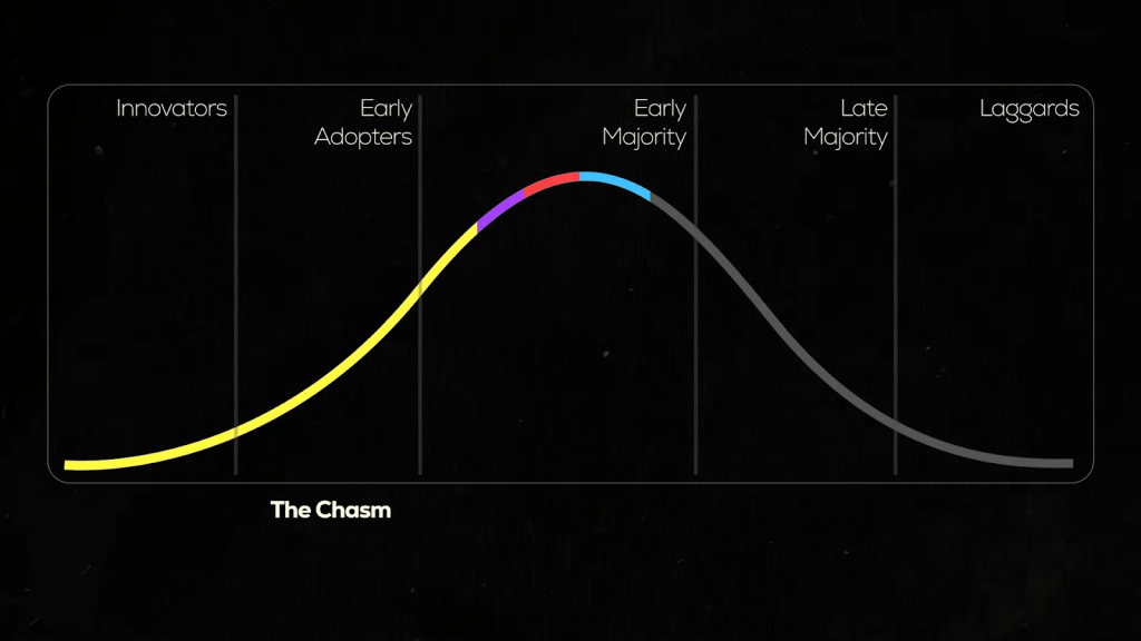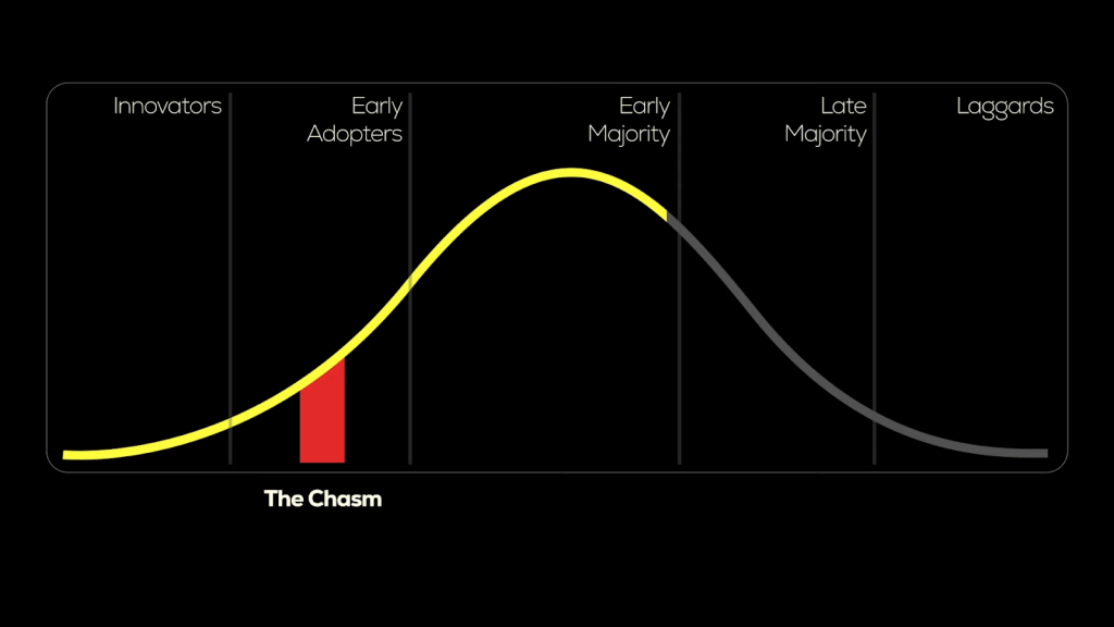 Whether it was the airplane, the television, the internet, or even writing on paper. The Greek philosopher Socrates spoke about how the invention of writing would promote forgetfulness. Whatever it was, history keeps on repeating itself. The adoption of something transformative is always met with resistance until something called “the chasm”. This is the point where the world begins to appreciate the transformative value an innovation has, and only once society has moved past the chasm do we begin to see mass adoption. Depending on the innovation, it could take society decades to move past it.