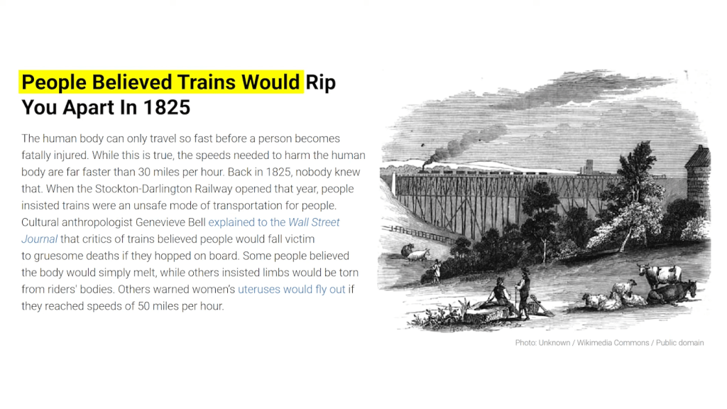 Let’s draw some parallels from the past. Back in 1825, people believed that trains would rip you apart and that high speeds would cause your body to melt.