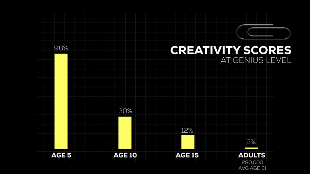 In 1968, a study followed 1,600 children from the age of five until they were 15. The aim was to determine the effect that school had on creativity levels. In the study, creativity was determined by divergent thinking. Children were asked how many uses they could think of for everyday objects like a paperclip. The more uses they could think of, the more creative they were deemed to be. The average adult can think of maybe 10 to 15 uses, but the study found that before school, 98% of five-year-olds were classed as geniuses based on this measure of creativity. The same children were then retested at 10 years old and again at 15. The results were astounding. What we concluded, wrote George Land, the author of the study, is that non-creative behavior is being learned.