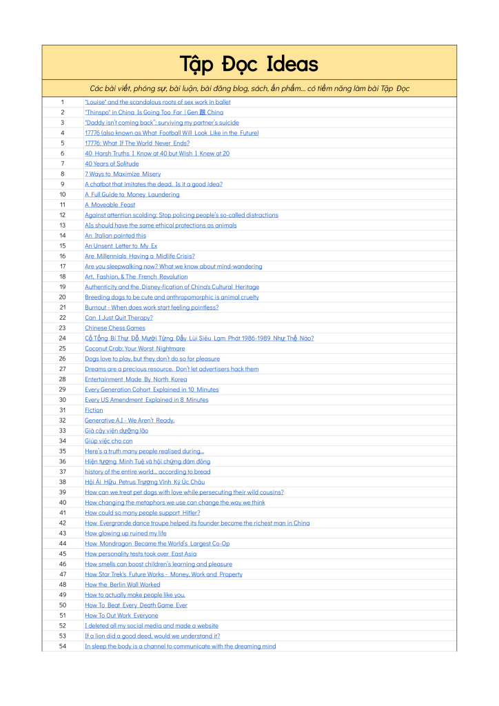 Từ đầu năm 2024 này, mình có tập trung nâng cao chất lượng của báo Tập Đọc, trong đó có cả mảng chọn nguồn làm bài đọc. Ngày nào mình cũng đọc và chọn lọc các bài đọc từ các nguồn mình thấy thú vị, trong đó chừng 10% được thực sự lên báo, còn lại thì mình vẫn lưu trong “kho” là một thư mục đánh dấu trang có tên “Tập Đọc Ideas”.