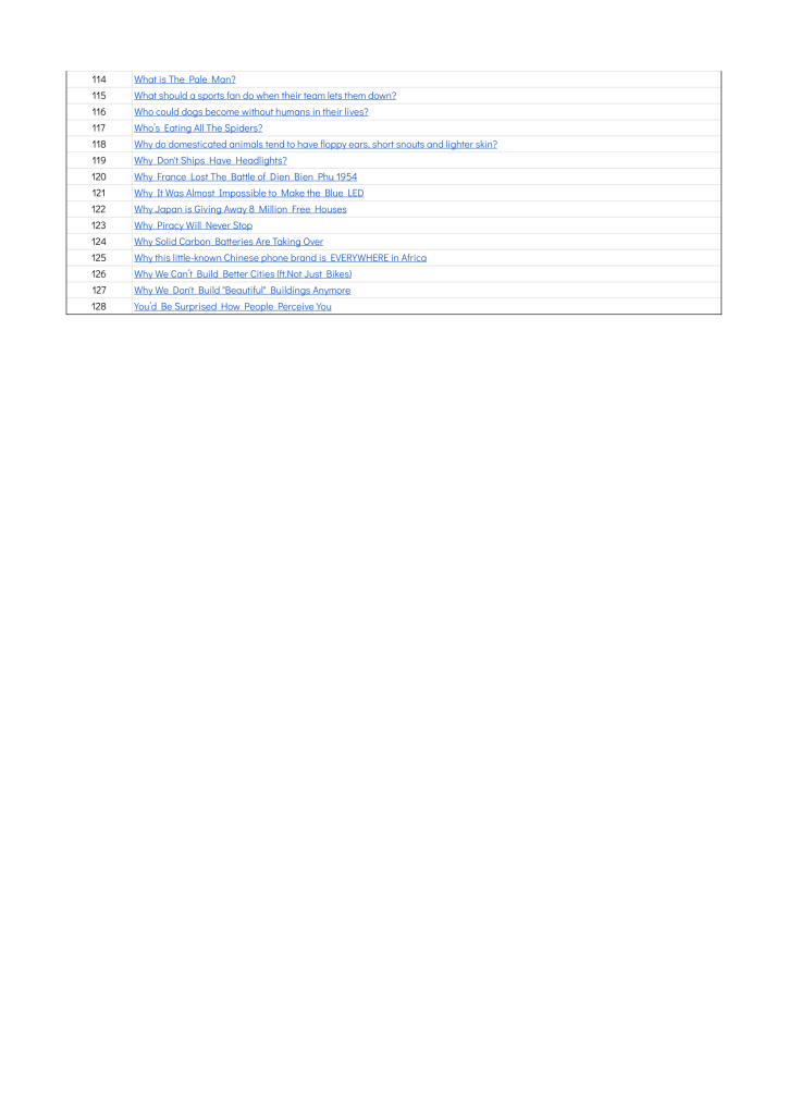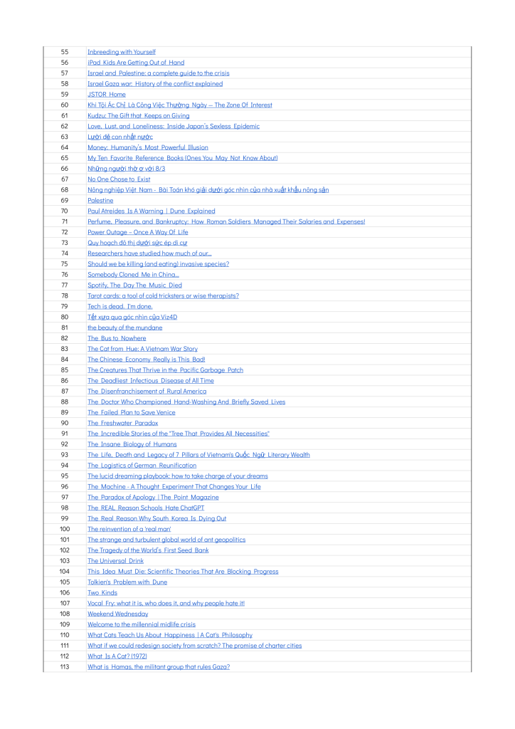 Đến hôm nay thì thư mục ấy đã dài quá, đến 128 bài khác nhau, mình muốn xóa bỏ đi hết để có chỗ trống lưu các bài mới. Nhưng dù sao đây cũng là các nguồn đọc mình cho là thú vị, bỏ đi thì phí, mình lưu lại trong một bảng Google Sheet để biết đâu sau này quay lại dùng.