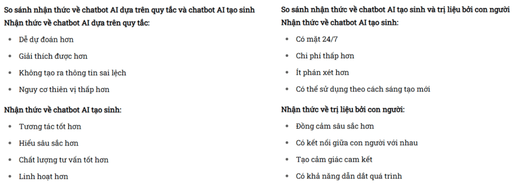 | Research into AI-assisted therapy underscores this. Studies such as those evaluating Woebot, Wysa, and even ChatGPT suggest that these tools are best seen not as replacements, but as supplements — digital tools that can provide emotional support, encourage cognitive restructuring, or offer psychoeducation. | Các nghiên cứu về trị liệu hỗ trợ bởi AI cũng nhấn mạnh điều này. Những nghiên cứu đánh giá các công cụ như Woebot, Wysa, và thậm chí cả ChatGPT cho thấy rằng chúng nên được xem như những công cụ bổ trợ — những công cụ số có thể hỗ trợ cảm xúc, khuyến khích tái cấu trúc nhận thức hoặc cung cấp kiến thức tâm lý. |